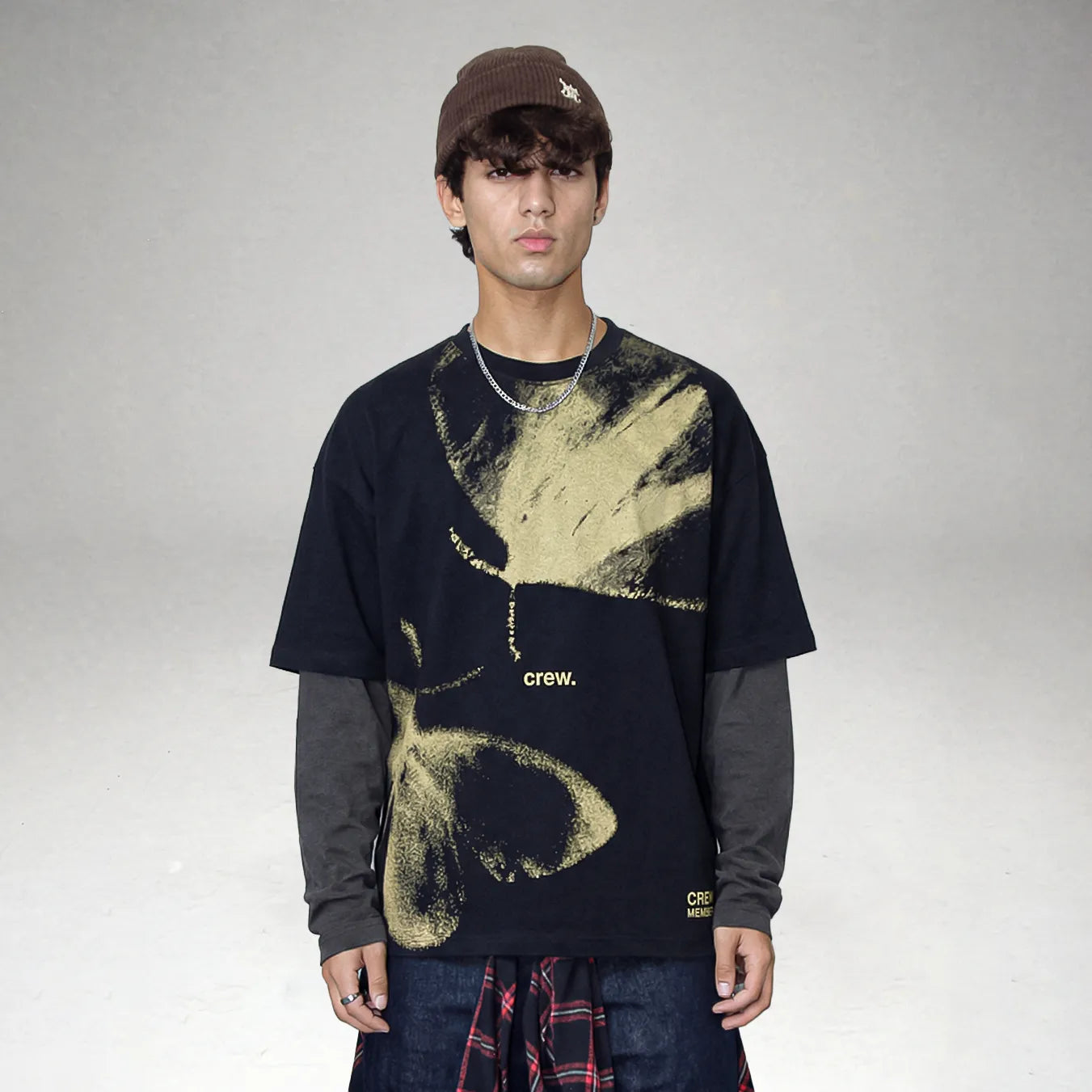 - Distressed butterfly/moth print in muted gold for a raw, vintage feel