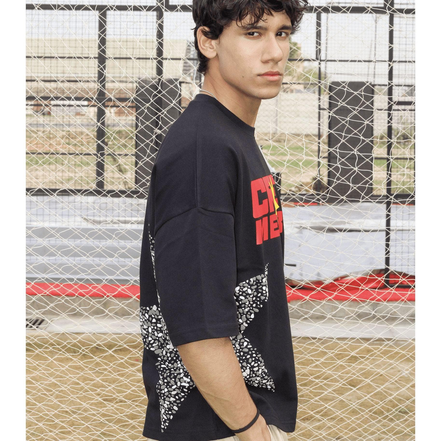 A clean, bold statement piece for everyday wear. The Crew Member Tee features a relaxed oversized fit, crafted from soft, high-quality cotton. The red and yellow graphic print adds a striking contrast, while the subtle stone-patterned detail gives it an extra edge.