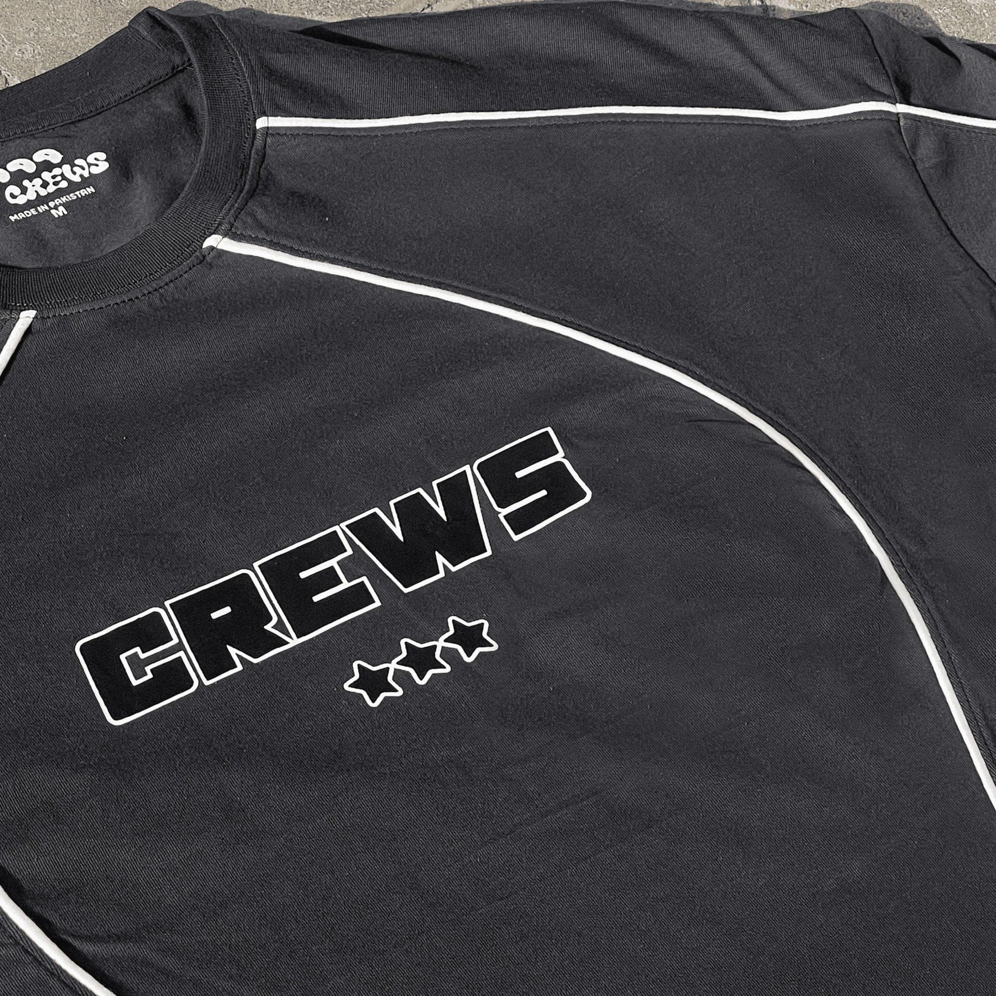 A fusion of streetwear and techwear, this tee features contrast piping that highlights its structured paneling. The bold "CREWS" branding and triple-star emblem add an athletic edge, making it a statement piece for any urban wardrobe.