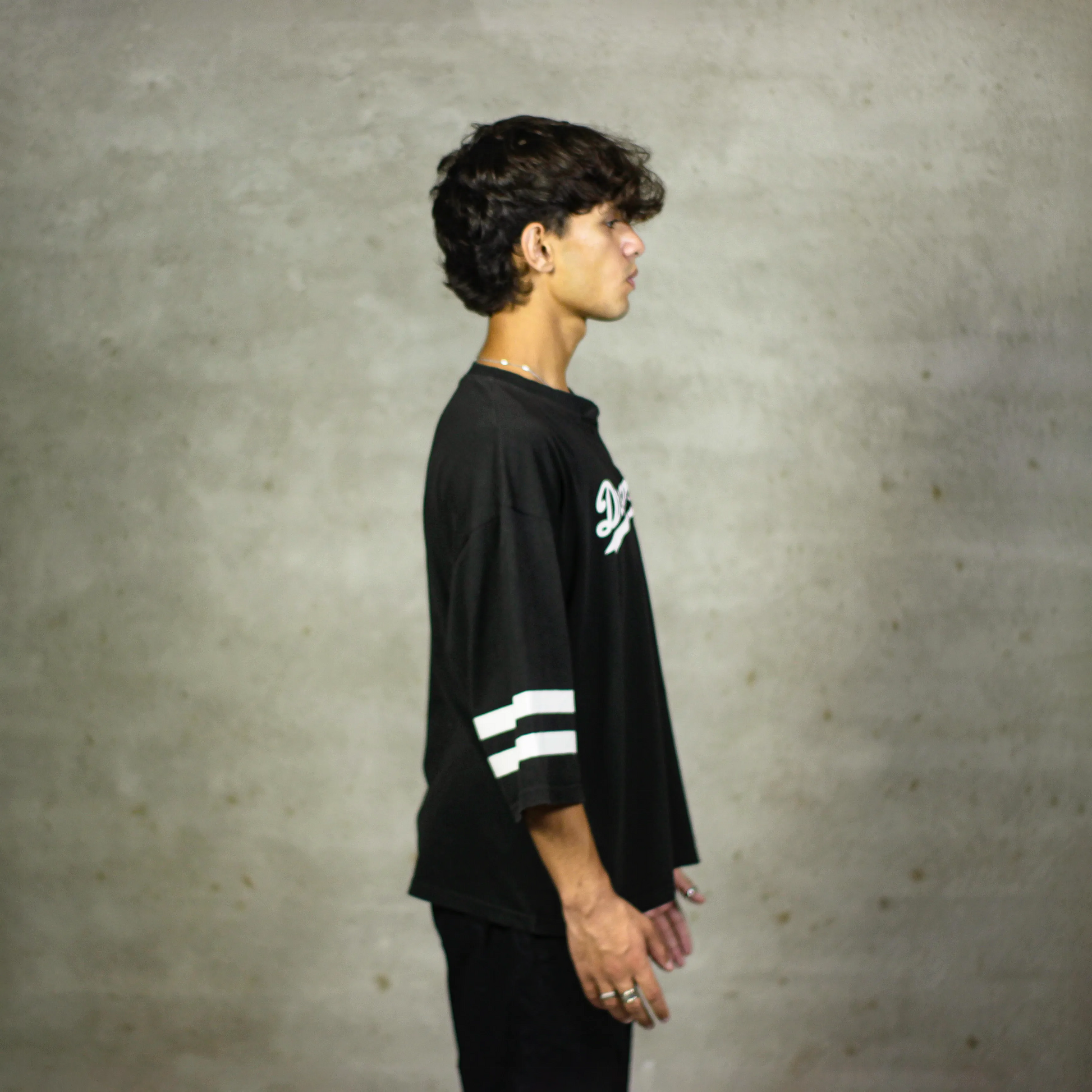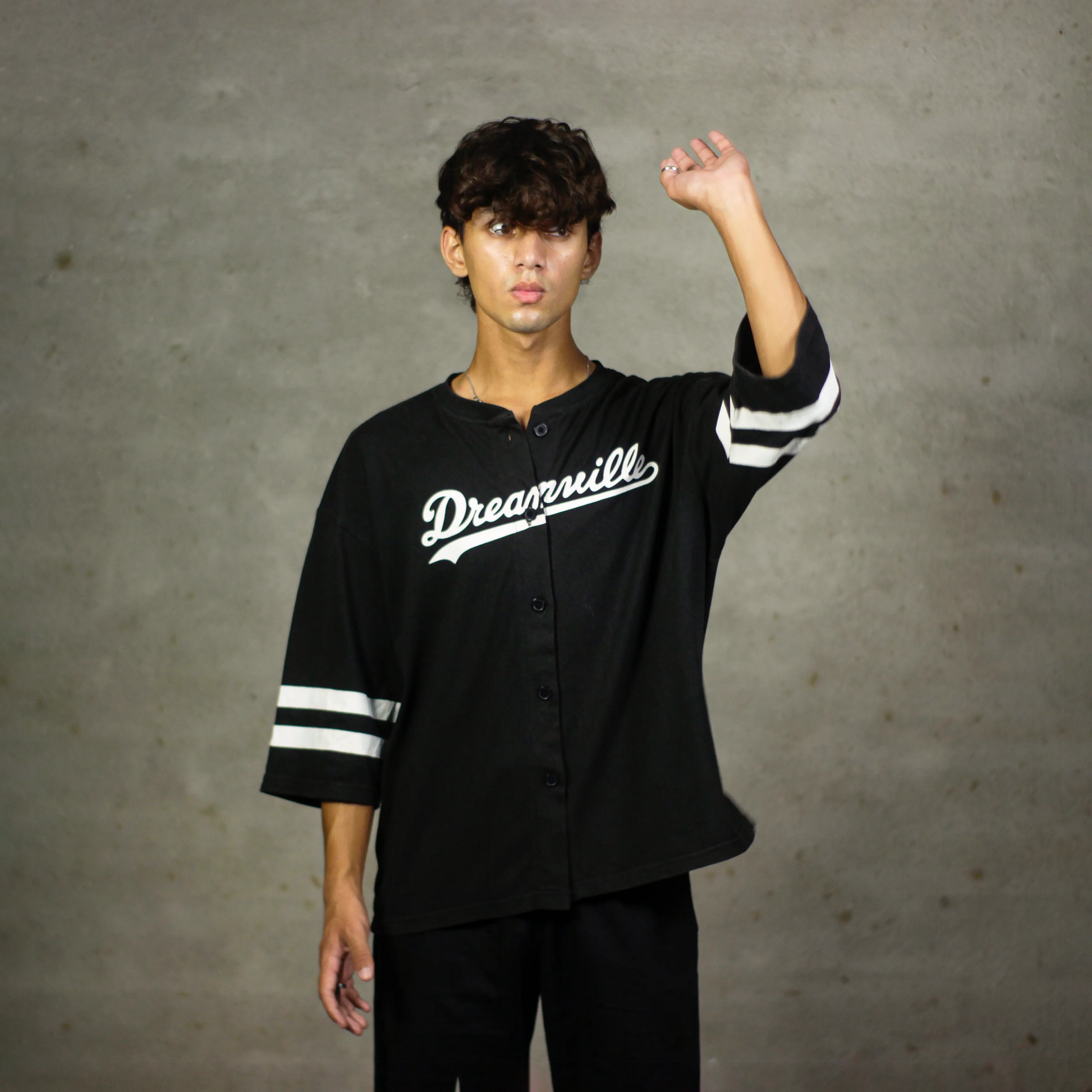 Baseball-cut jersey in heavyweight 220 GSM cotton with a relaxed drop-shoulder fit. Features contrast double stripes on both sleeves and a bold “Dreamville” tackle twill appliqué across the chest. Button-down front closure and curved hem finish off this retro athletic piece. Built for both sport and street.