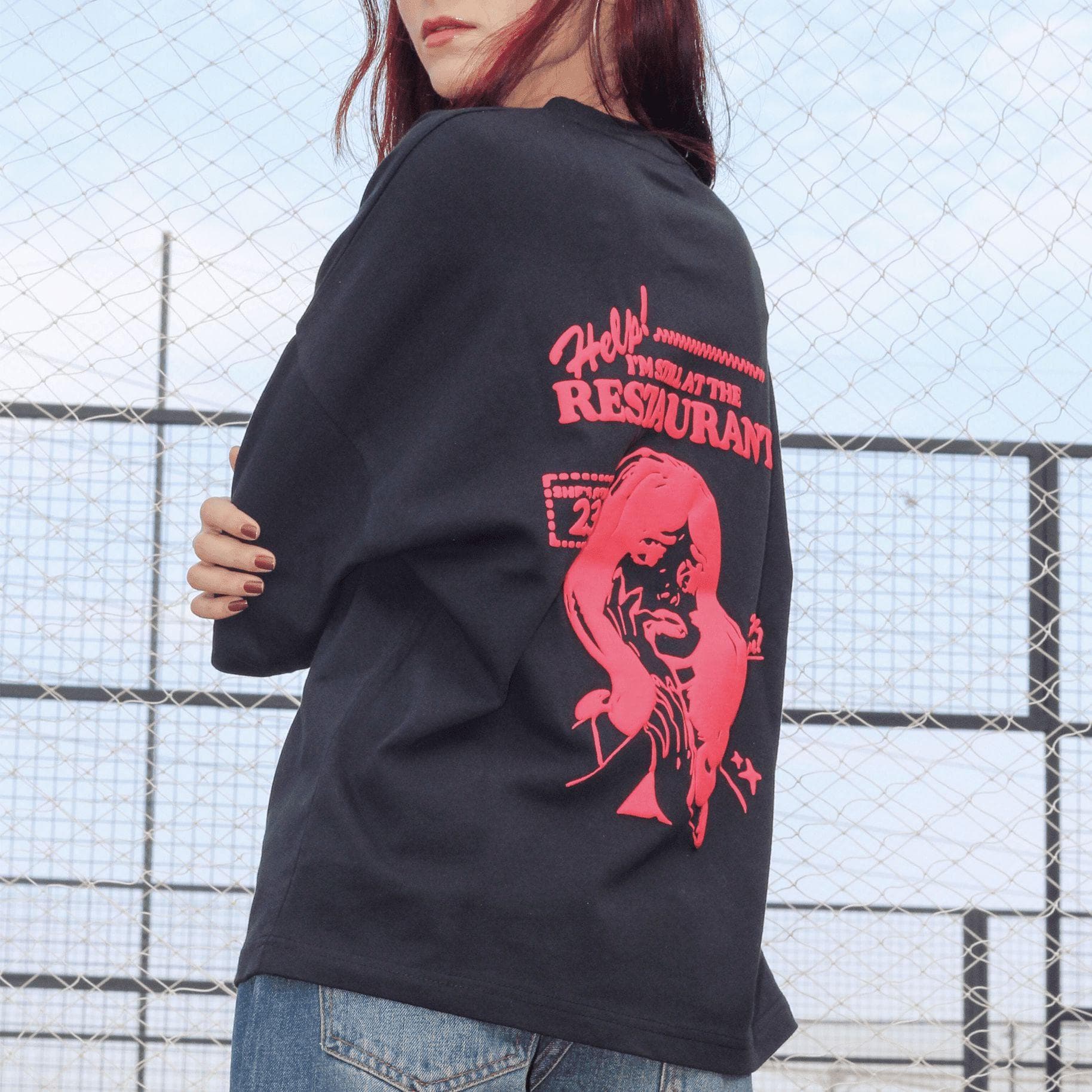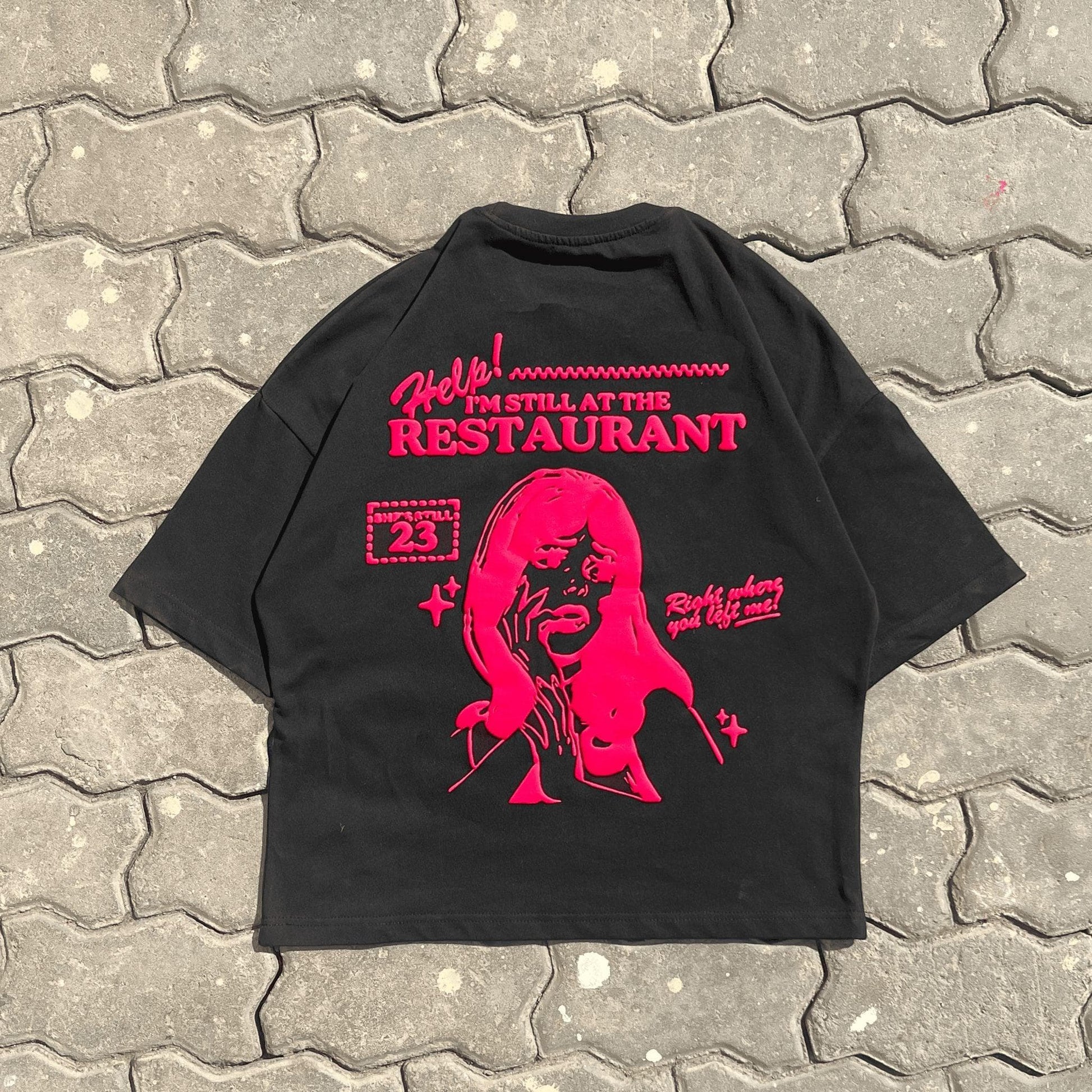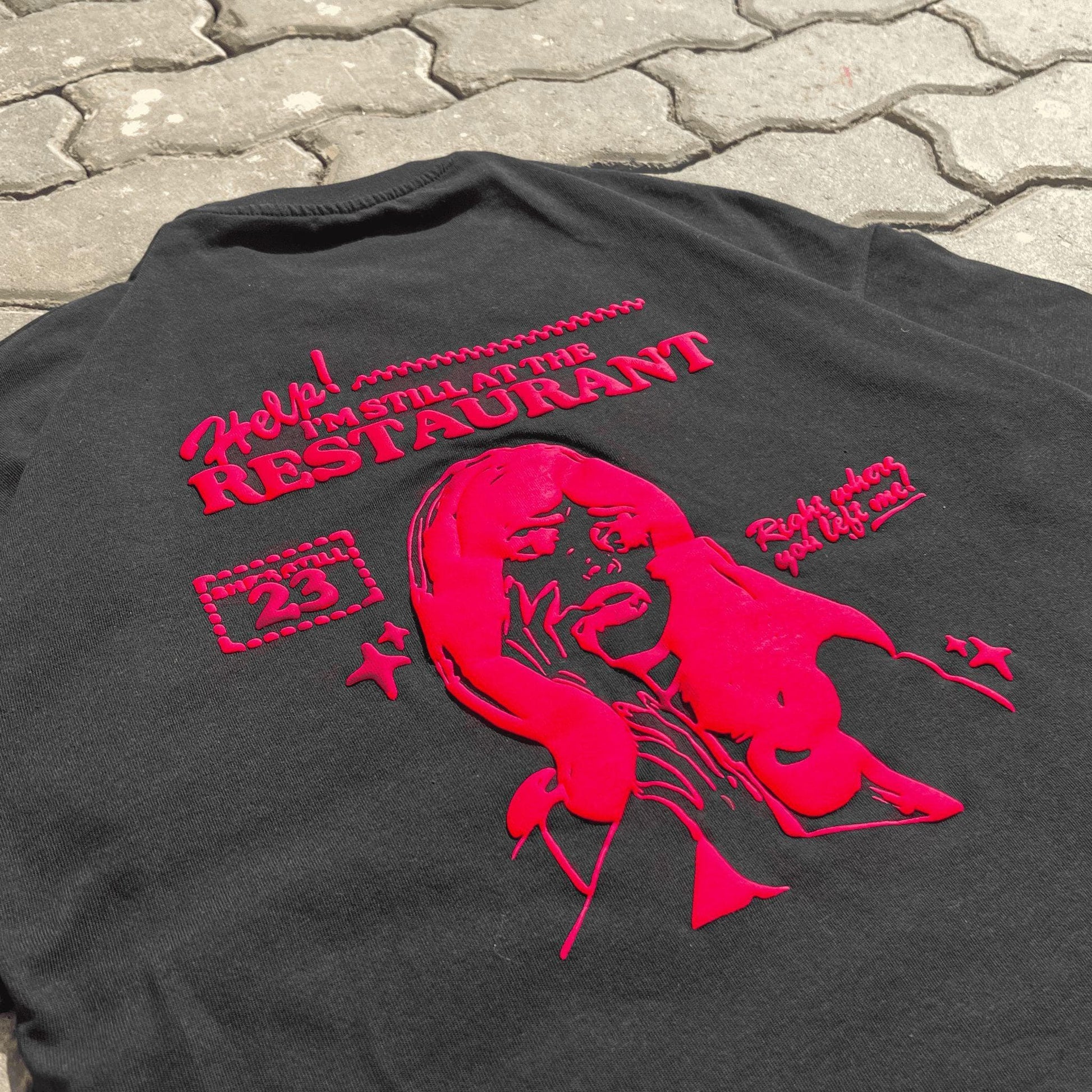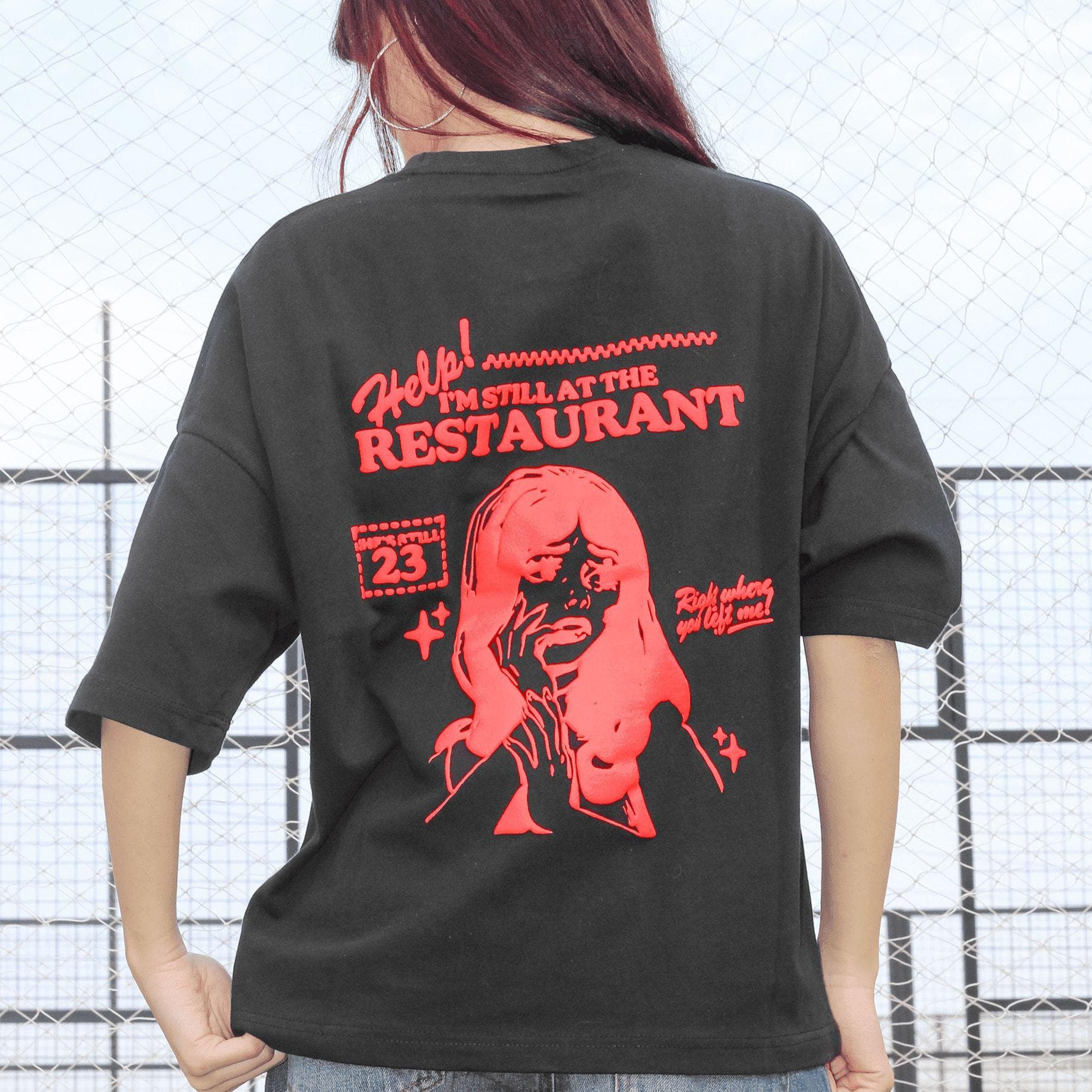 A bold graphic tee inspired by a moment frozen in time. The Still at the Restaurant Tee features an oversized fit on soft black cotton, with striking red artwork and text that echo nostalgic, cinematic energy. A statement piece with just the right touch of irony.