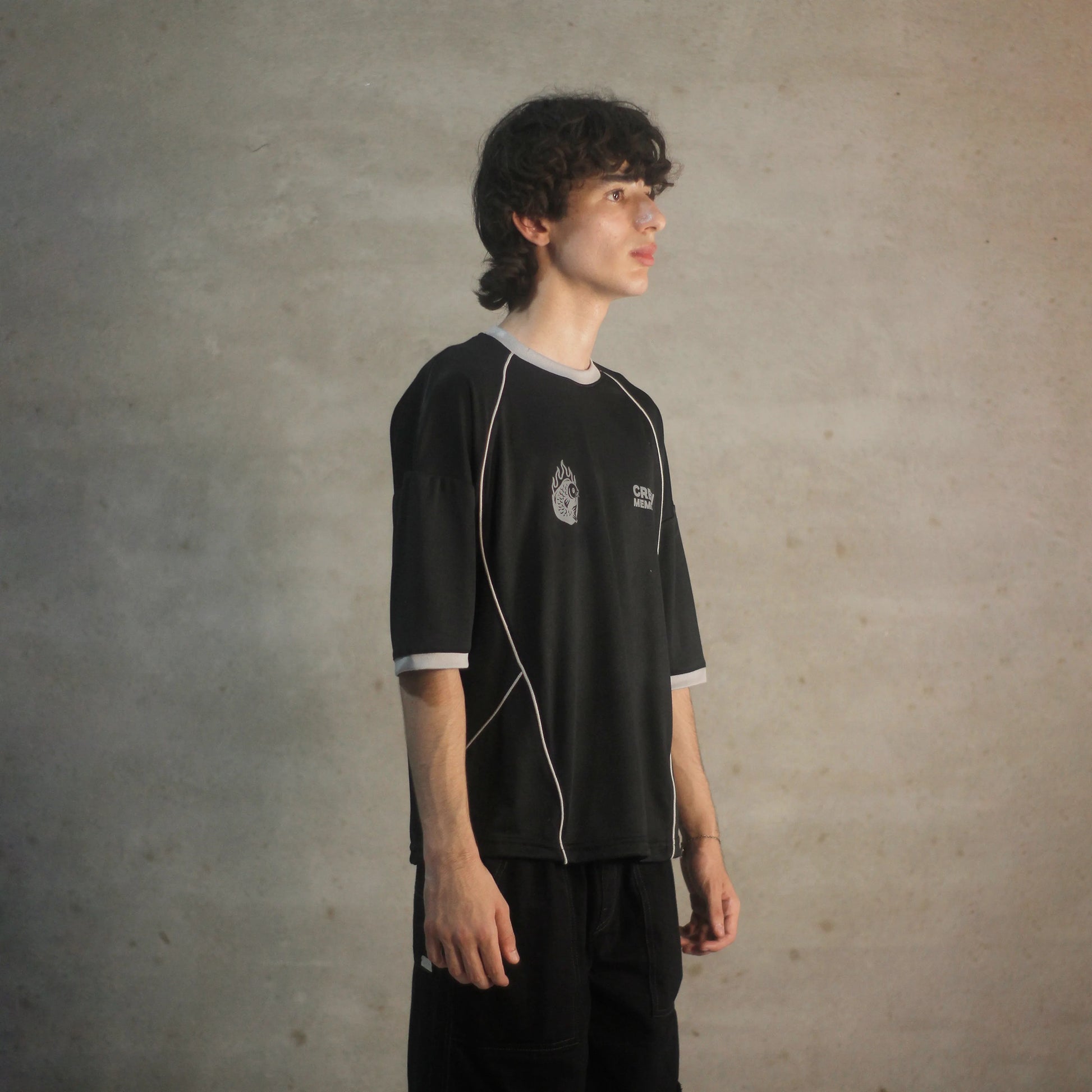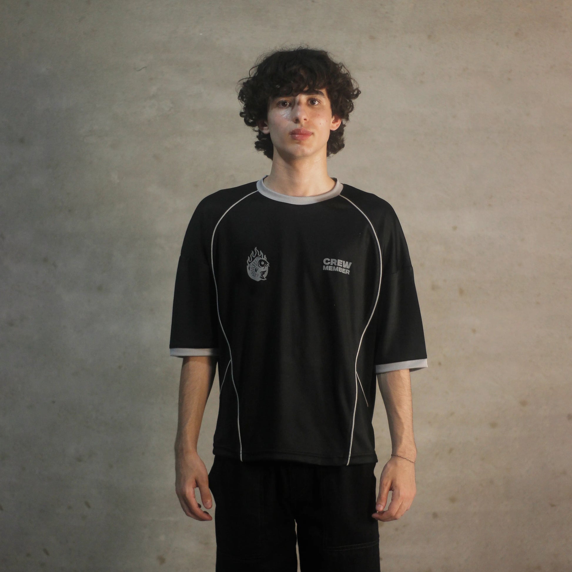 A blackout performance tee with a bold flame crest, built for movement and presence. Breathable dry-fit keeps you ready for heat. Squad essential, matchday energy.